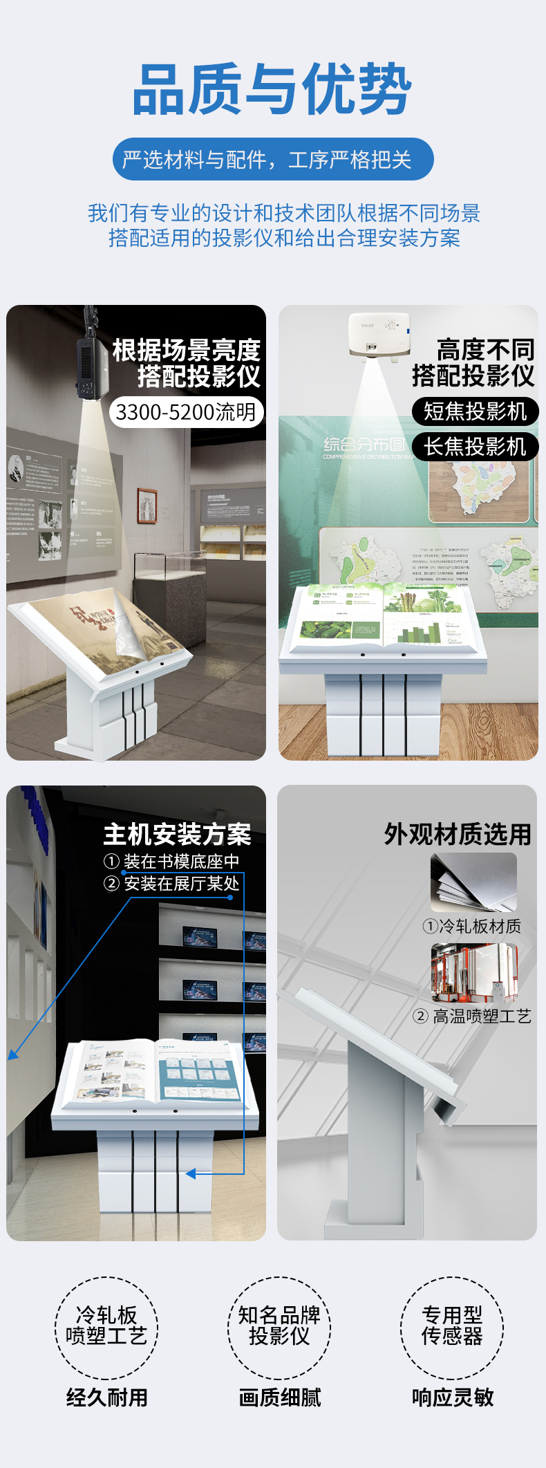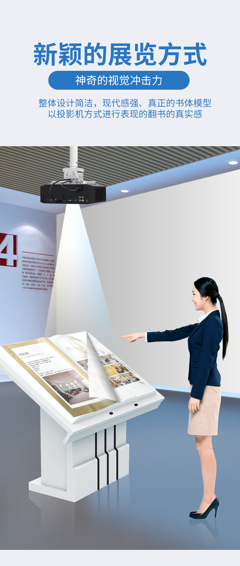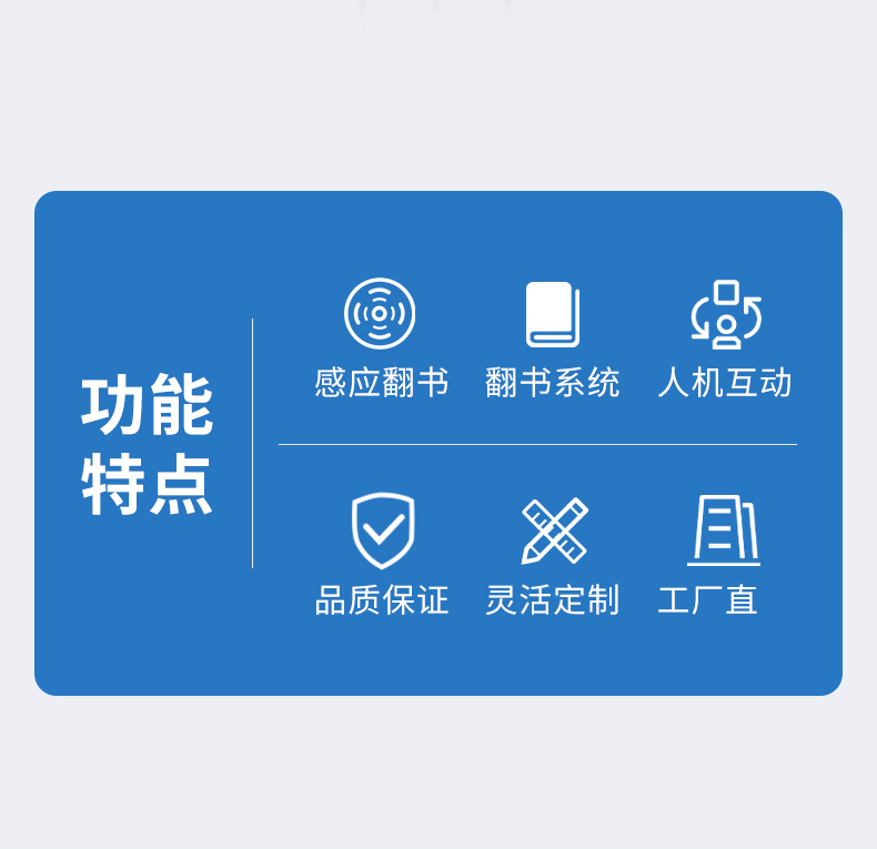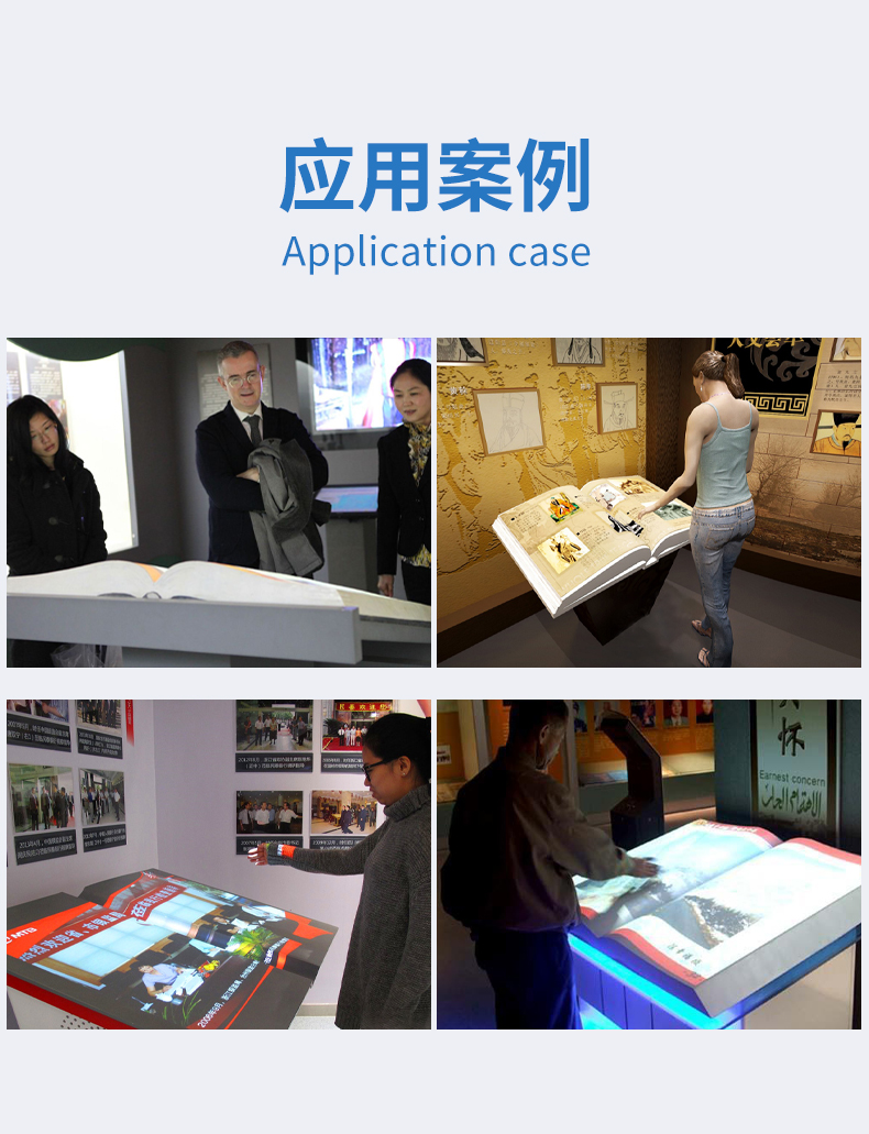 虛拟翻書又(yòu)稱電(diàn)子翻書、互動翻書、翻書軟件、隔空翻書、空中(zhōng)翻書、自動翻書、魔幻翻書、立體(tǐ)翻書、虛拟翻頁(yè)、虛拟電(diàn)子書等。 虛拟翻書猶如一本打開的書籍,裏面可(kě)以記載豐富的資料(包括動畫、視頻、圖片)。參觀者可(kě)以揮動手臂“翻閱”書籍,自左向右或者自右向左,還可(kě)以選擇章節,快速找到您想翻閱的内容,就像翻閱一本普通的雜志(zhì)一樣,這就是虛拟翻書系統帶來的驚喜!虛拟翻書形式新(xīn)穎,視覺沖擊力強,給人以神奇感,而且可(kě)以展示的信息量大。